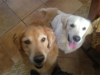 "Kate and Alli came to live with us when they were 2 months old. The girls are sisters from a litter in which the mother was a golden retriever and the father was some type of shepherd. They did everything together as puppies. They slept so closely against each other, we called them bookends. As they grew older, we did not recognize the subtle signs of problems between them until they reached 5 years of age. They began viciously attacking each other even when we were in the room with them. We had a number of vet visits for stitches and antibiotics. In one particular fight, while trying to separate the girls, I was bitten several times. This fighting is what led me to call Rob Lerner, Dog Behaviorist.